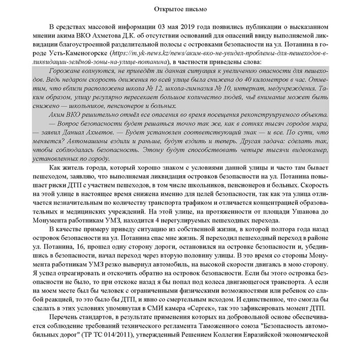 В средствах массовой информации 03 мая 2019 года появились публикации о высказанном мнении акима ВКО Ахметова Д.К. об отсутствии оснований для опасений ввиду выполняемой ликвидации благоустроенной разделительной полосы с островками безопасности на ул. Потанина в городе Усть-Каменогорске (статья на сайте yk-news), в частности приведены слова: