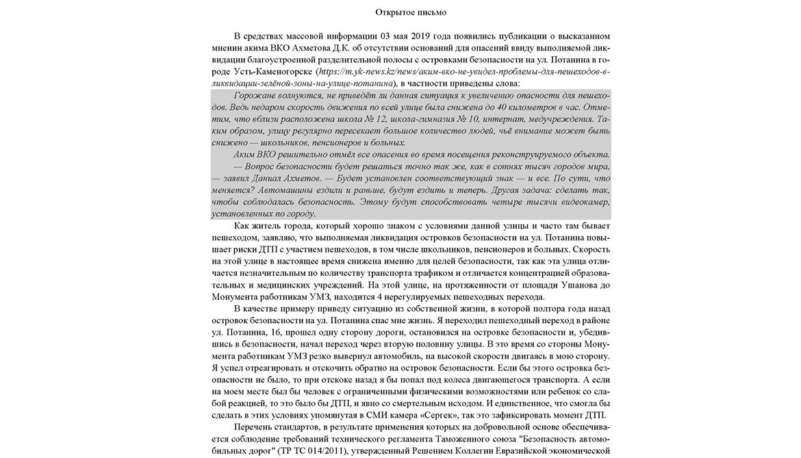 В средствах массовой информации 03 мая 2019 года появились публикации о высказанном мнении акима ВКО Ахметова Д.К. об отсутствии оснований для опасений ввиду выполняемой ликвидации благоустроенной разделительной полосы с островками безопасности на ул. Потанина в городе Усть-Каменогорске (статья на сайте yk-news), в частности приведены слова: